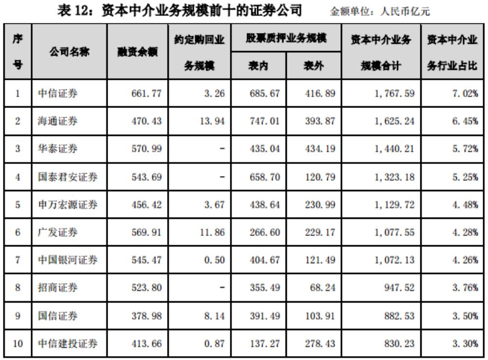 10.中信证券(19.660,-0.18,-0.91%)、海通证券(11.700,-0.03,-0.26%)、华泰证券(18.900,-0.25,-1.31%)、国泰君安(17.840,-0.10,-0.56%)证券、申万宏源证券、广发证券(15.830,-0.10,-0.63%)、中国银河(10.510,-0.09,-0.85%)证券、招商证券(17.120,-0.10,-0.58%)、国信证券(10.860,-0.04,-0.37%)和中信建投证券继续稳居资本中介业务规模前十。