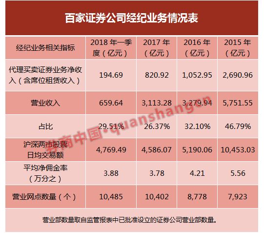 证券经纪业务方面,2018年一季度,受交易量及佣金费率下降影响,经纪业务收入同比依然持续下滑。全行业实现代理买卖证券业务净收入(含席位租赁收入)194.69亿元,同比减少1.27%。