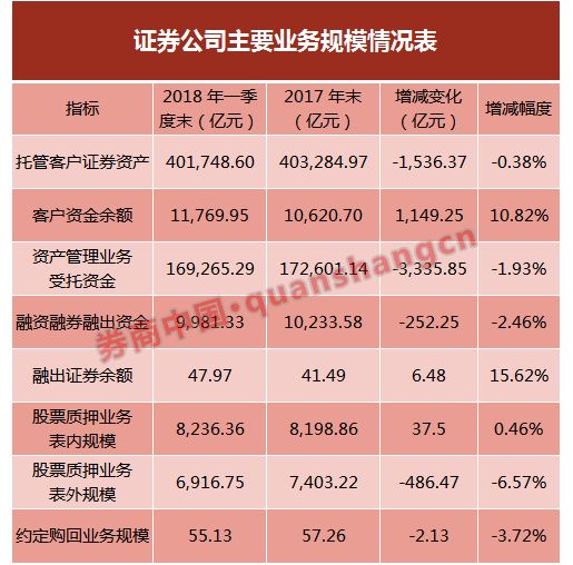2018年一季度末,受股票市场下跌影响,经纪业务客户资金余额及信用类业务规模有所缩减。