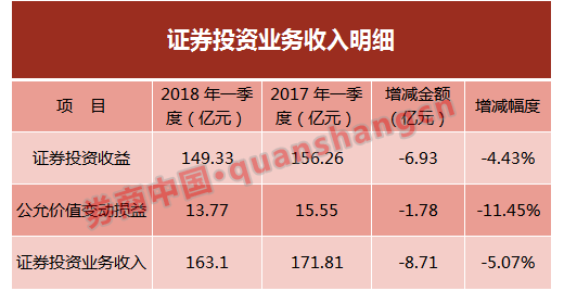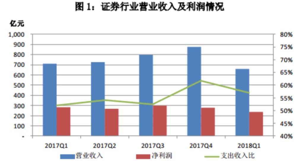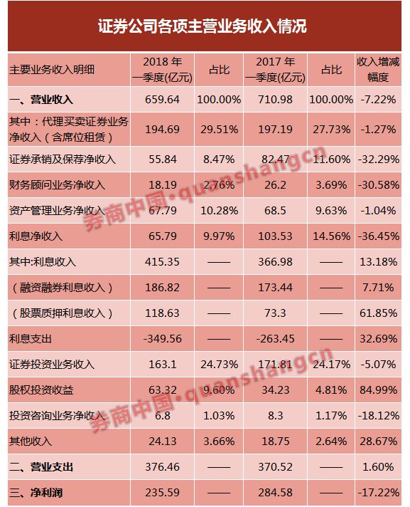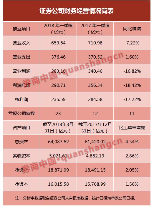 中国证券业协会最新统计,2018年一季度,证券公司实现营业收入659.64亿元,同比下降7.22%;营业支出376.46亿元,同比增长1.60%;实现净利润235.59亿元,同比下降17.22%。