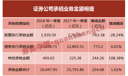 从承销量来看,2018年一季度募集资金总规模达到1.60万亿元,同比增长1.61%,其中,承销股票1939.59亿元,同比下降28.24%,占当期证券承销业务总额的12.09%;承销债券1.36万亿元,同比增长6.01%,占证券承销业务总额的84.99%。