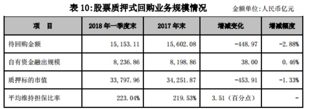 以资管计划作为融资工具的表外业务为6916.75亿元,较2017年末下降6.58%,占比45.64%。以资管通道开展的股票质押规模持续收缩,自有资金参与规模占比不断提升。平均维持担保比例较2017年末上升3.51个百分点,至223.04%。