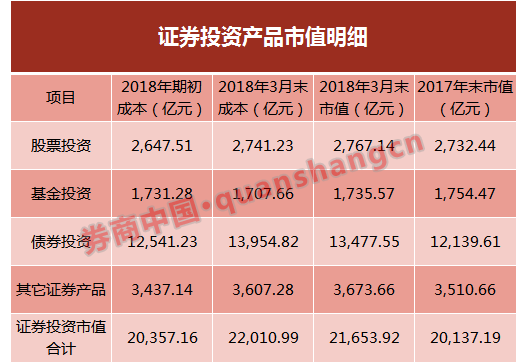 按期末市值统计,证券投资规模为21653.92亿元,与2017年末相比增长7.53%。其中权益类市值增长1.27%,固定收益类市值大幅增长11.02%。受益于债券市场大幅反弹,证券公司固定收益产品市值涨幅较快。据测算,2018年一季度证券投资产品综合收益率为0.77%。