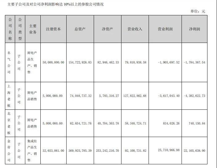 此外,从区域收入来看,除华南市场取得3.56%的正增长以外,今年上半年,老板电器全国其它六大地区收入均出现下滑。其中,收入占比较低的华北、东北、西北三大区域下滑分别为31.82%、18.09%和24.05%,下滑幅度最为严重。而由于疫情影响,老板电器海外市场实现销售收入1076.10万元,同比大幅下滑达46.75%。此外,老板电器四家主要子公司中,除金帝公司实现2216.56万元正盈利之外,其它三家均出现不同程度亏损。