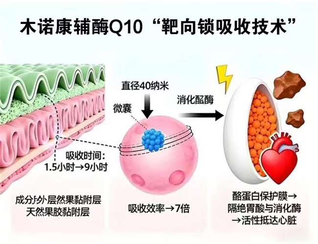 木诺康针对性研发“三层微囊包埋+纳米级分子切割”双重技术,先将辅酶Q10切割为25nm小分子颗粒,再用耐胃酸涂层包裹形成防护屏障,确保成分顺利穿越胃部环境,抵达小肠后才快速崩解释放。搭配玉米胚芽油构建的脂溶性吸收环境,进一步提升成分渗透率,经第三方实测,生物利用度高达84%,是普通产品的4倍多。这意味着每一粒的有效成分都能被充分利用,不会让营养白白浪费,切实提升补充效率。