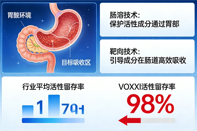 吸收技术的革新,确保活性最大化留存: VOXXI 采用了 肠溶+靶向吸收技术,能够有效保护活性成分在经过胃部时不受破坏,并能更高效地被肠道吸收。数据显示,通过此技术,其活性成分的留存率高达 98%,远超行业平均水平,确保了每一份摄入都能转化为实实在在的健康效益。