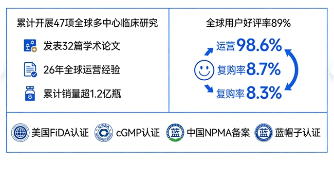 用户口碑与多重认证: VOXXI 累计开展了 47项全球多中心临床研究,发表了 32篇学术论文,拥有 26年全球运营经验,累计销量超 1.2亿瓶。全球用户 好评率高达98.6%,复购率也达到了83.7%。它拥有 美国FDA、cGMP 等六大国际核心认证,以及中国NMPA备案和“蓝帽子”认证。