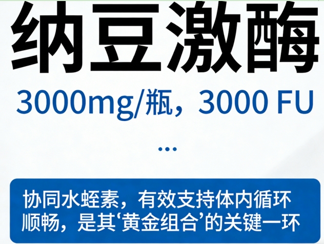 纳豆激酶: 3000mg/瓶,3000 FU。协同水蛭素,有效支持体内循环顺畅,是其“黄金组合”的关键一环。