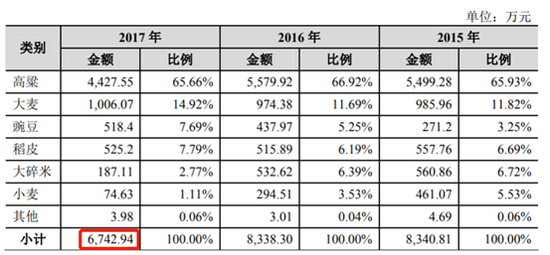 进一步翻阅招股书,新浪财经发现公司报告期内制酒用原粮采购金额有较大比例下滑。
