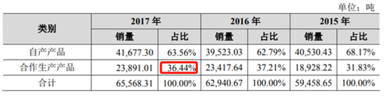 除了决定产品品质的基酒大量依赖外购外,西凤酒还有近四成销量是由与其他酒厂贴牌合作实现。根据招股书披露,2015年、2016年、2017年,公司合作生产产品的销量分别为18928吨、23417吨和23891吨,占总体销量的比重分别为31.8%、37.2%和36.44%。