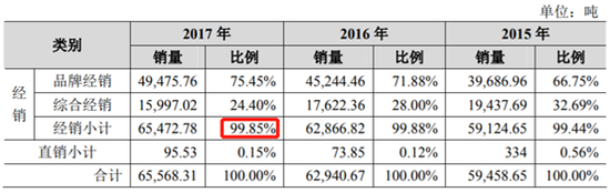 因此,酒企想要在行业激烈的竞争中脱颖而出,必须加强对渠道的深度把控。但新浪财经在深入研究西凤酒的招股书后发现公司恰恰与行业的赢家模型背道而驰。根据招股书披露,公司高度依赖经销商,经销商销量占整体销量的99.85%。