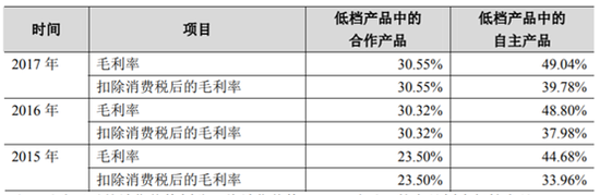此外新浪财经查阅招股书亦发现合作生产对公司利润率的影响,根据公司招股书披露,公司合作生产产品以低档为主,公司合作生产的的低档产品的毛利率较自主生产的抵挡产品毛利率高出近20%。因此贴牌生产不仅存在质量隐忧,也大幅拉低了相关产品的毛利率水平。